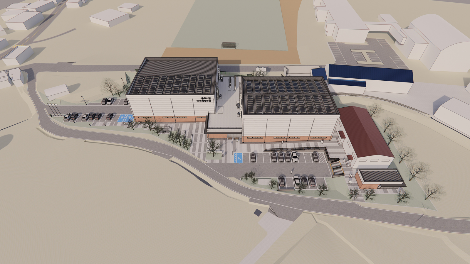 공주시립 다목적체육관은 공주시 배드민턴협회의 오랜 숙원사업으로, 총 10면의 배드민턴 코트를 수용하는 체육시설이다. 비교적 크지 않고 불규칙한 대지 조건을 고려해 체육관을 두 개의 독립된 공간으로 분절하여 배치하였으며, 이를 통해 이용 인원이 적은 시간대에는 하나의 체육관만 운영함으로써 냉·난방 및 조명 에너지 사용을 합리적으로 절감할 수 있도록 계획하였다.